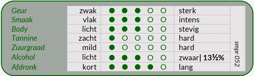 De fles is een verhaal apart; zelden zo’n zware fles gehad. Dit wordt gedaan om de kwaliteit van de wijn te onderstrepen, maar dat is in dit geval eigenlijk niet nodig. Ik vind hem zo ook wel goed.