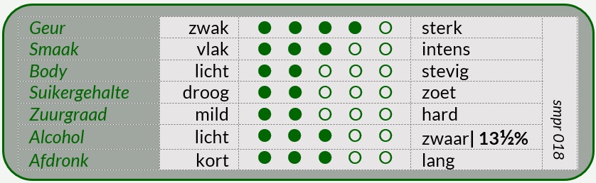Deze Chardonnay heeft een verfrissende geur met citroen, banaan en peer gevolgd door warme aroma’s van geroosterd brood en vanille. In de mond een rijke, volle smaak met geroosterde noten, toast en vanille en een zachte zuurgraad.