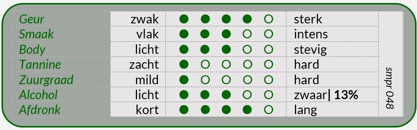 Deze Pinot heeft een zoete aandronk en de kenmerkende kersen / pruimengeur. De tannines zijn zacht en de zuren mild. Misschien deze dagen licht gekoeld drinken (een graad of 16). Pinot Noir gaat goed bij Boeuf Bourguignon en bij gerechten zoals stamppot van boerenkool, patrijs en wildpaté.