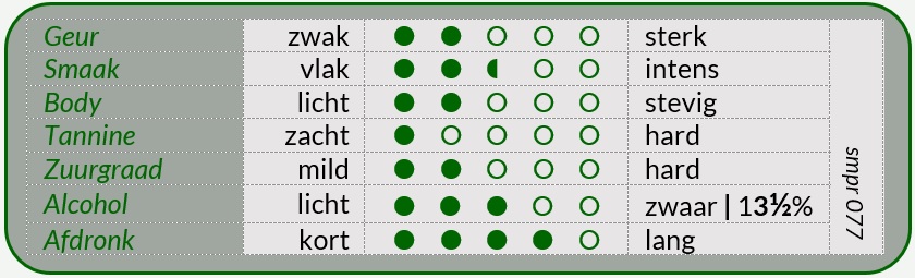 De wijn heeft een kersengeur, is zacht met makkelijke tannines, sappig en niet te zwaar. Drinken op de vroegere kamertemperatuur van 17 à 18 graden. De wijn is lekker bij de borrel, BBQ, lichte hoofdgerechten en pasta’s. De wijn heeft sinds de aanmaak nog enkele jaren gerijpt bij de wijnmaker en is daarom intussen prima op dronk.
