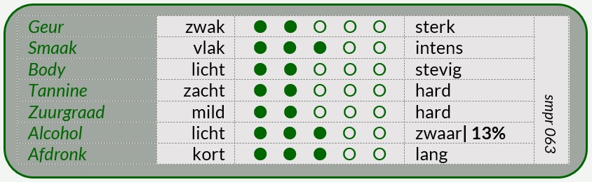 We dronken de wijn licht gekoeld (18 graden) en ontdekten een “fruity”, sappige en makkelijk drinkbare wijn. Ruikt naar donker fruit en heeft op de achtergrond wat aardse tonen, heeft een intense smaak (vlezige kers) en is stiekemweg toch ook wel een stevige wijn. Het alcoholpercentage is 13% en de wijn heeft een behoorlijk lange afdronk. Past goed bij onze huidige zwoele zomeravonden.